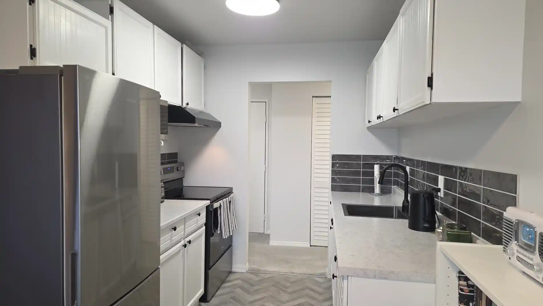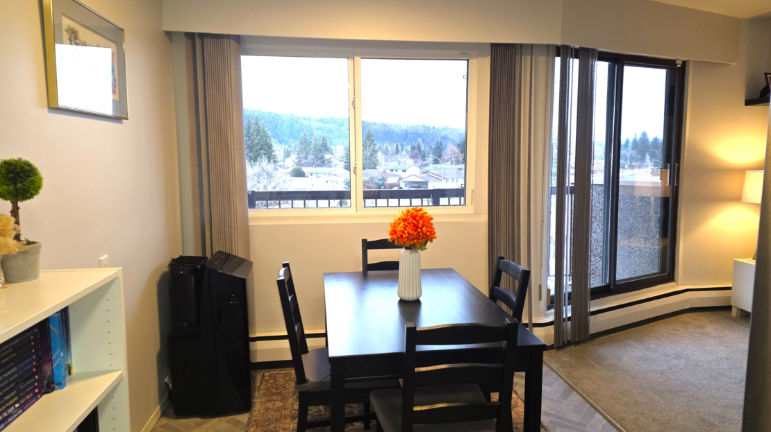 Step inside and enjoy the convenience of this beautifully updated top-floor 1-bedroom condo in Panorama Place. Featuring all-new flooring, fresh paint, vinyl windows, and new blinds throughout. The kitchen has been tastefully updated with a new countertop, backsplash, sink, faucet, and appliances. The bathroom is fully refreshed with a new bathtub and surround, toilet, sink, and faucet. The hallway closet offers new doors and custom shelving, while the generous 7’4 x 4’9 storage room is currently set up as a functional sewing room. Relax on the 17′ x 5′ covered deck, perfectly positioned to enjoy summer evenings with northwest views toward Cranbrook Hill. Bonus amenities include one covered parking space, an indoor pool, sauna, exercise room, two elevators, garbage chute and laundry on the floor, a well-stocked library, and a common area available for gatherings or social events.