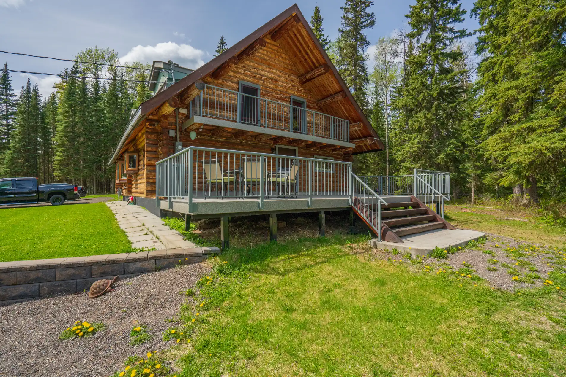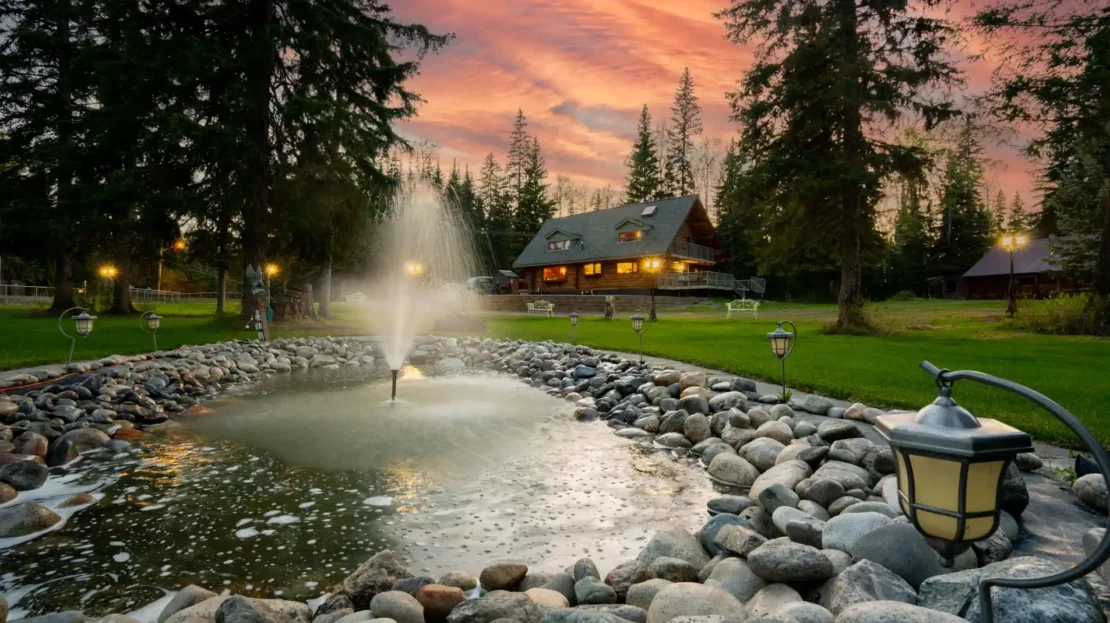 Private 5.62 acres w/log house in city limits!! This charming & well-maintained 3-bdrm log home offers the perfect escape from hustle & bustle of everyday life. Inside, you’ll find a warm & welcoming layout w/beautifully updated kitchen featuring cast iron sink, painted oak cabinets, & stylish backsplash. The open-concept lv/dn area is filled w/natural light from numerous windows, offering breathtaking views of surrounding landscape—including your very own pond. The back 30X16 deck, perfect for entertaining. Main floor offers 2 comfortable bdrms & full bath complete w/separate shower & luxurious soaker tub. Upstairs, the spacious fmrm includes a cozy gas f/p & walkout access to a 3’6″ x 25′ balcony. The estate-style primary bdrm is a true retreat, featuring its own 4’5″ x 24′ balcony.